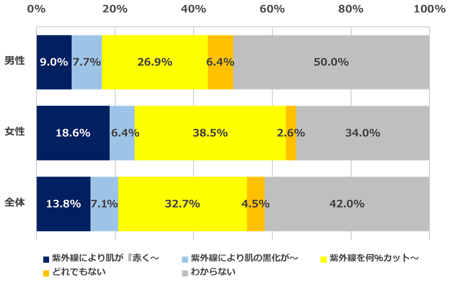 さらに「SPF」については、言葉の意味も伺いました。以下の5つの中より正しいと思うものを選んでいただいた結果、男性では「わからない」と回答した人が50.0%おり、意味を回答した人の中では「紫外線を何%カットしているかの指標」と回答した人が女性38.5%、男性26.9%でした。
